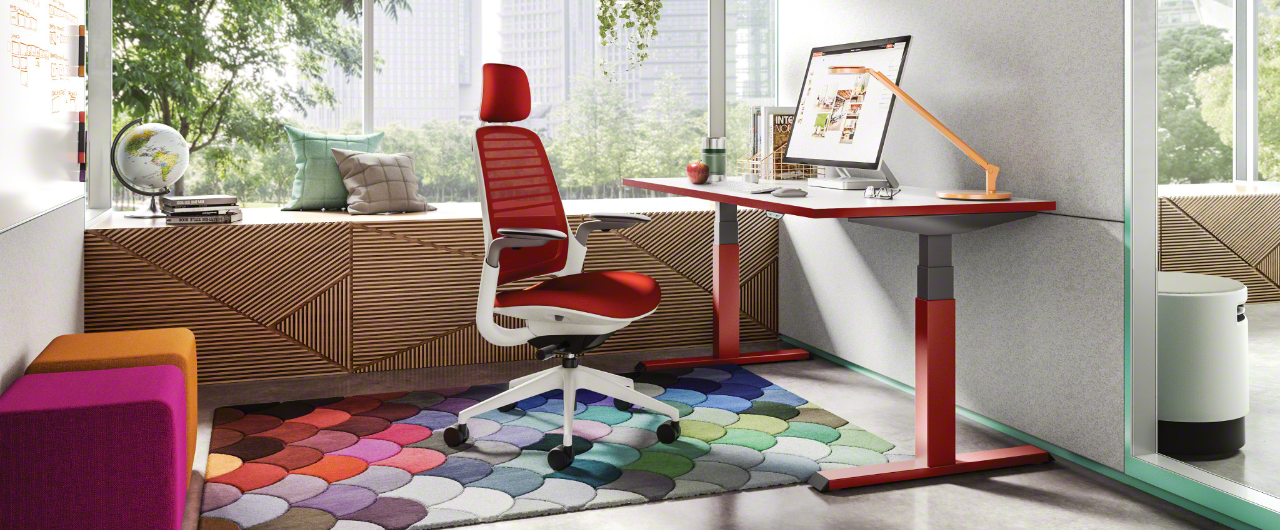 Ce bureau électrique réglable en hauteur de Steelcase permet aux utilisateurs de passer de la position assise à debout tout au long de la journée pour stimuler l’activité cérébrale et physique.