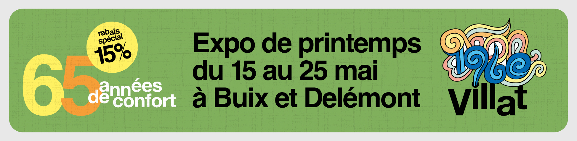 Villat Meubles vous invite du jeudi 15 au dimanche 25 mai à sa grande expo de printemps pour célébrez 65 années de confort. Durant ces dix jours, profitez dans nos magasins de Buix et Delémont, d'un rabais spécial de 15% !