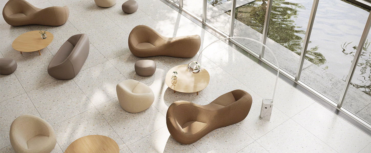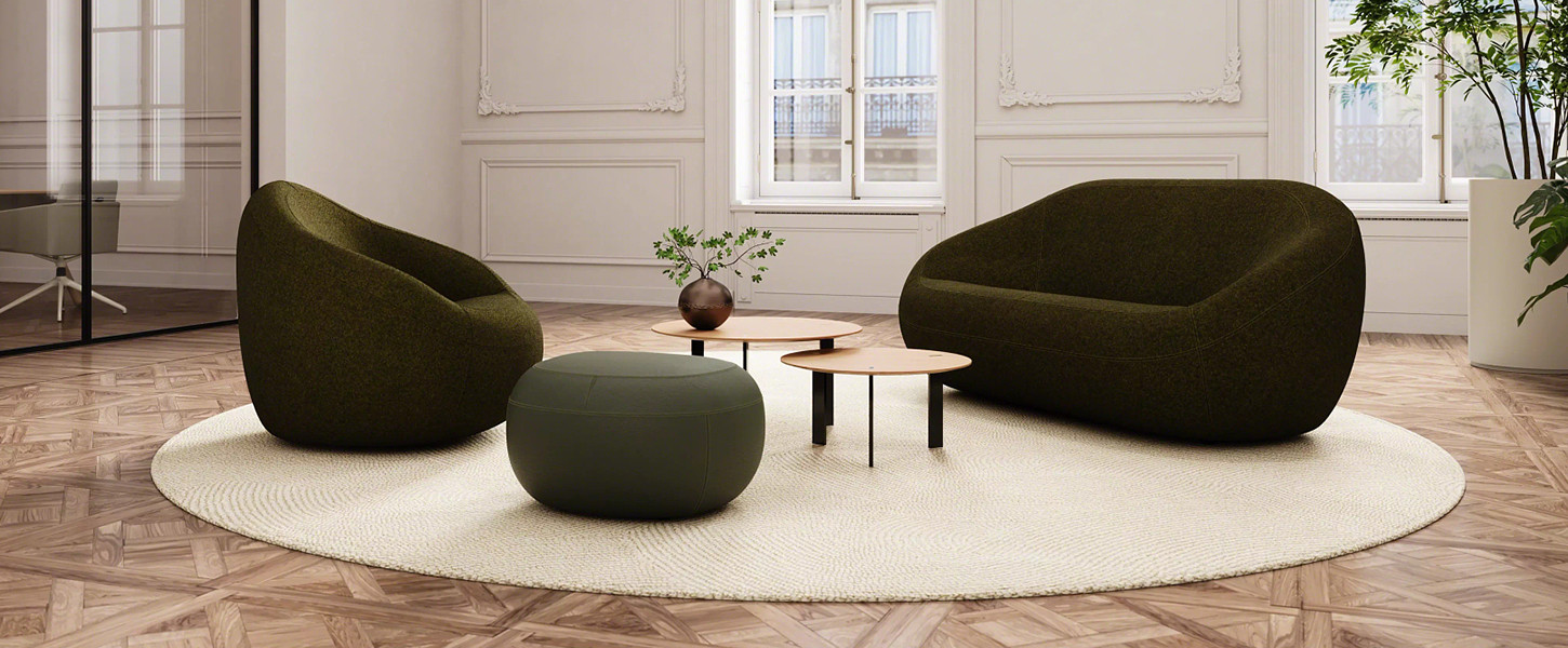 Pour cette collection, Jean Nouvel a voulu générer de la fluidité dans une forme et évoquer une relation poétique à l’eau. Cette collection a été conçue pour fournir non seulement des formes organiques et élémentaires qui rappellent des galets, mais aussi des formes biomorphiques, afin d’apporter soutien à votre dos et à vos bras.