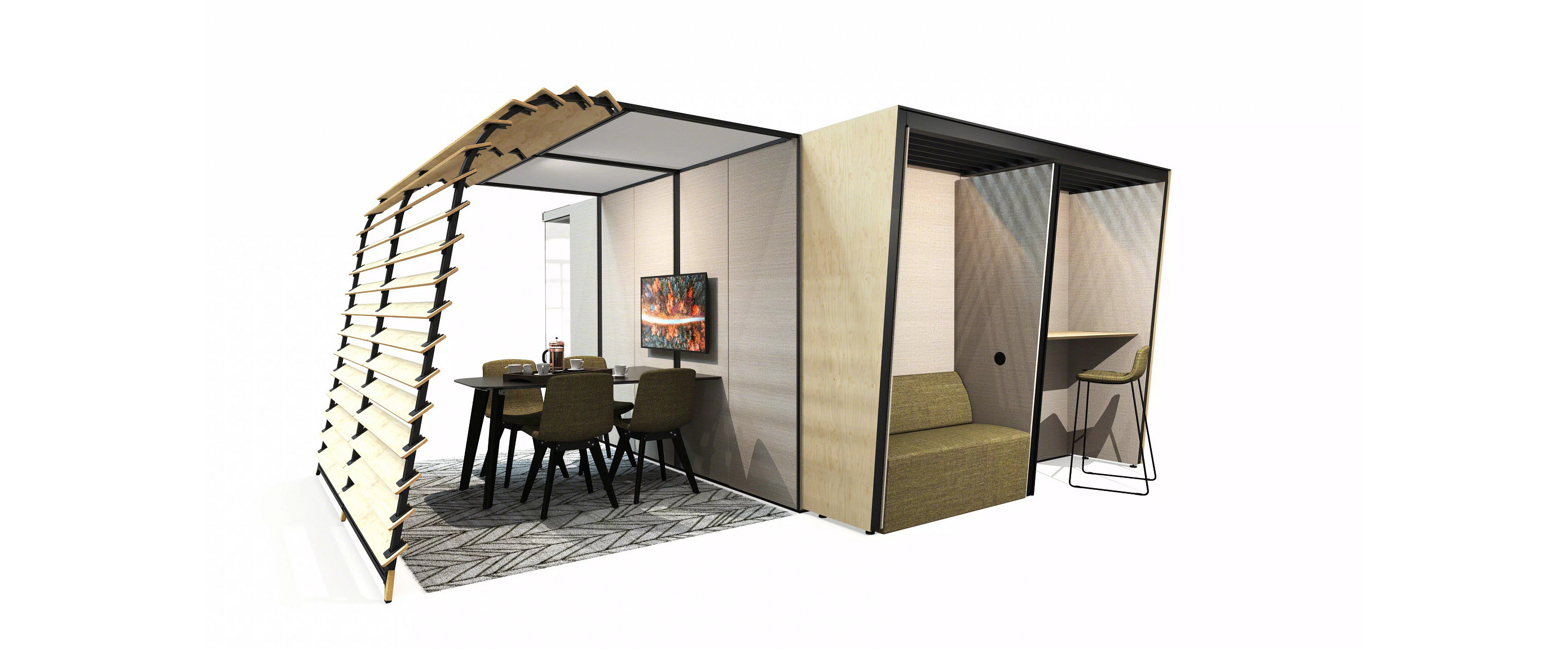 Entièrement personnalisable, Campers & Dens est un système de cabines qui offre différents niveaux d’intimité grâce à la combinaison de pods, alcôves et auvents.