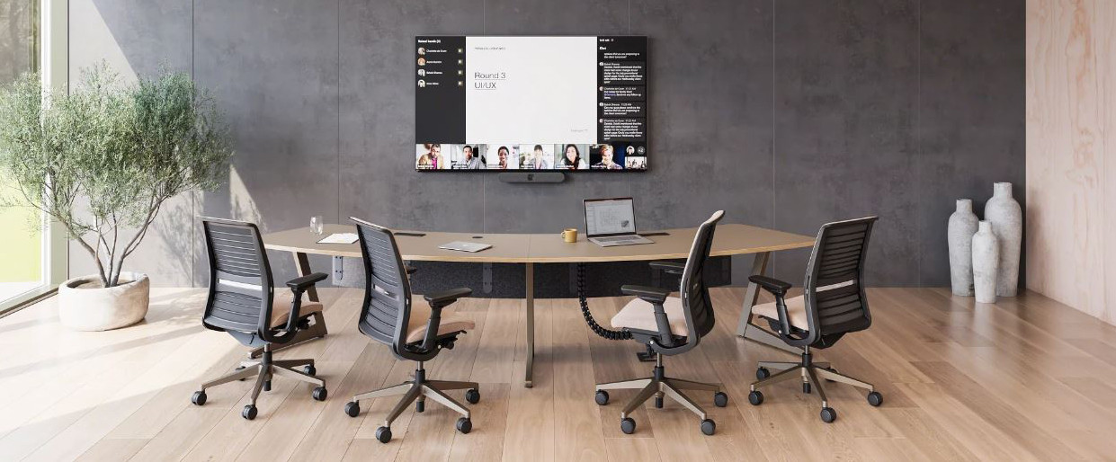 Conçue pour la collaboration hybride, la table de visioconférence Ocular de Steelcase offre une expérience plus équitable aux participants sur place ou à distance.