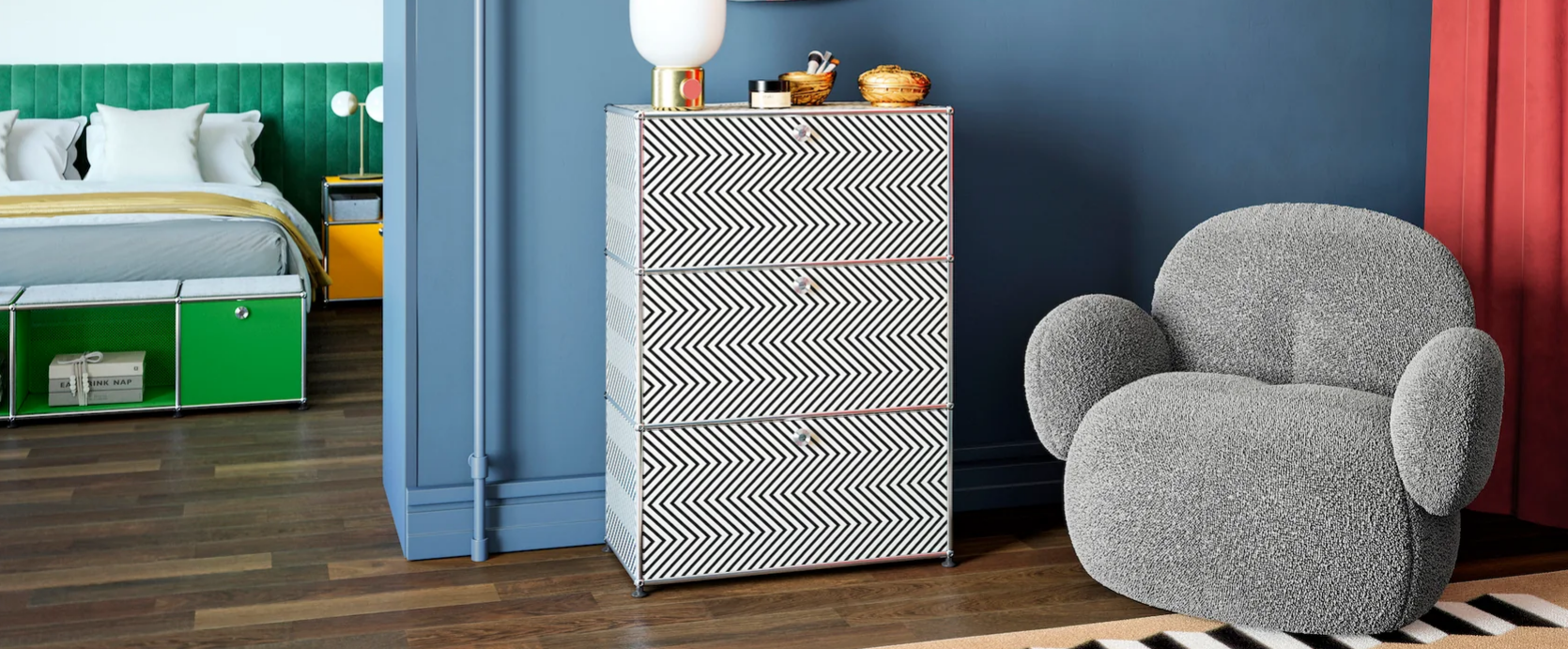 L’artiste suisse Claudia Comte a dessiné pour USM l’édition limitée ZIGZAG. Les lignes noires et blanches du zigzag évoquent un rythme de va-et-vient tel des vagues ou un rayonnement. Cette collection exceptionnelle de trois meubles permettra de financer un projet de l’ONG Seven Hills en Jordanie pour l’éducation aux enfants défavorisés. Les trois meubles sont limités à 50 exemplaires chacun.